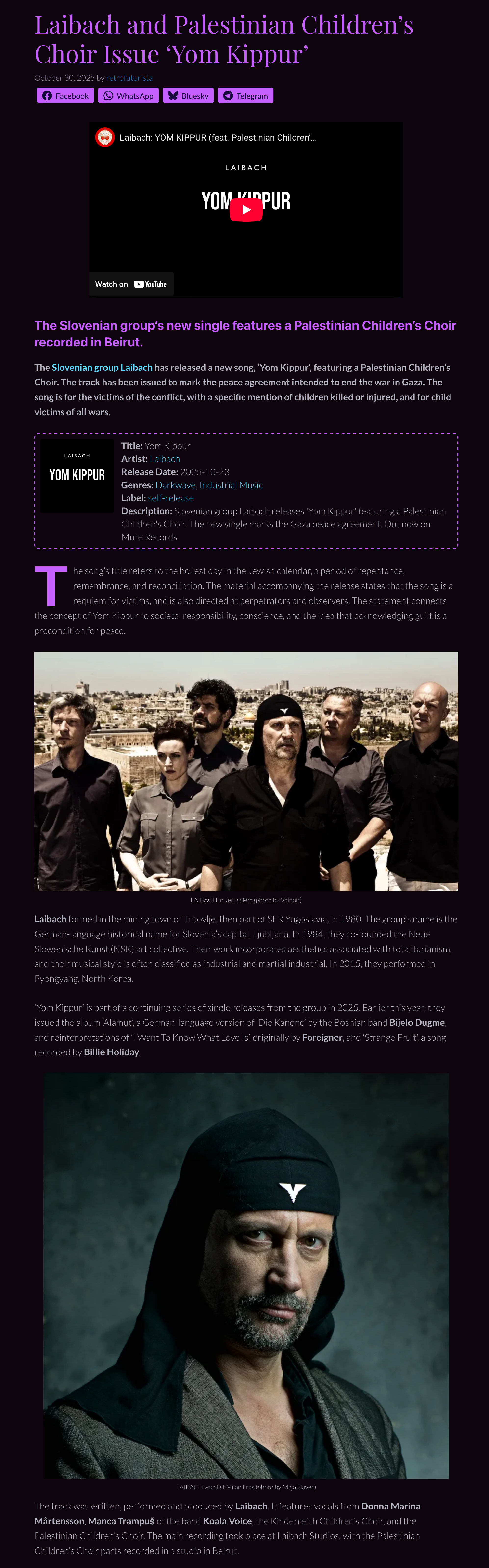 - Laibach issues ‘Yom Kippur’ single featuring Palestinian Children’s Choir via Nika / 23. 10. 2025