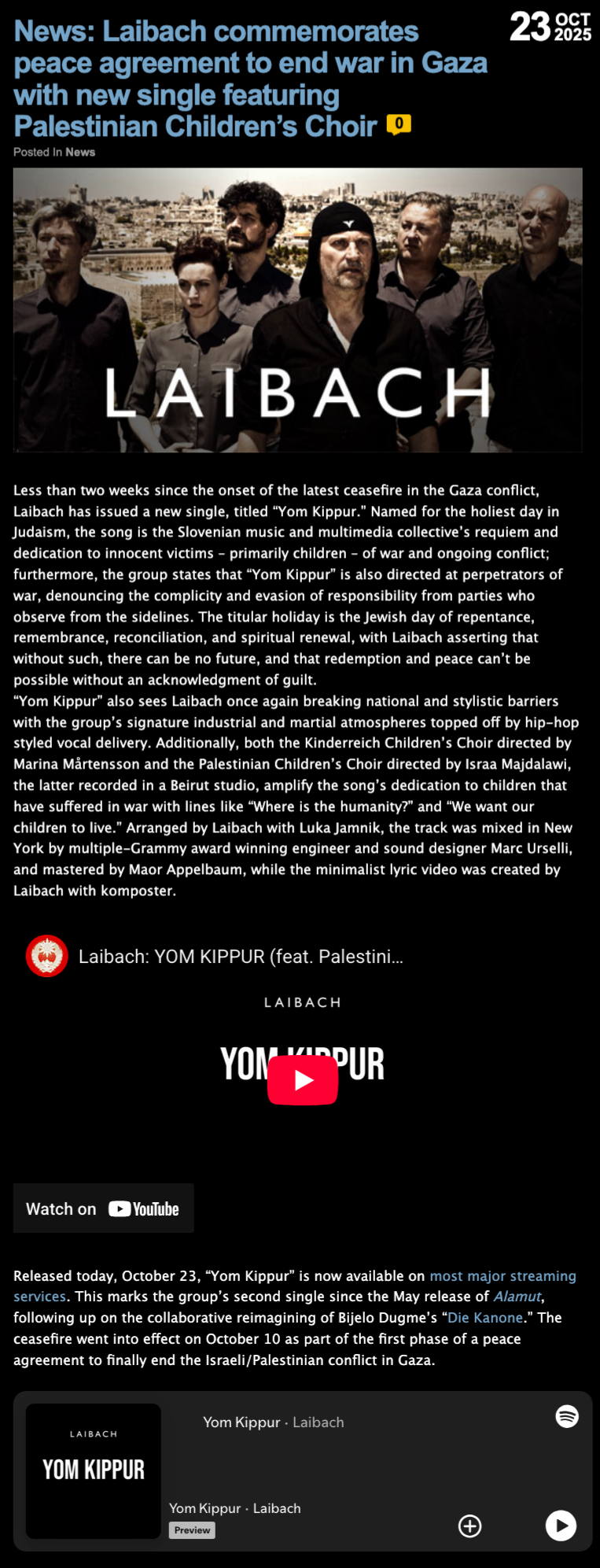 - Laibach | ‘Yom Kippur’ – new single by Slovenian group commemorates peace agreement to end war in Gaza : out 23rd October 2025 / 26. 10. 2025