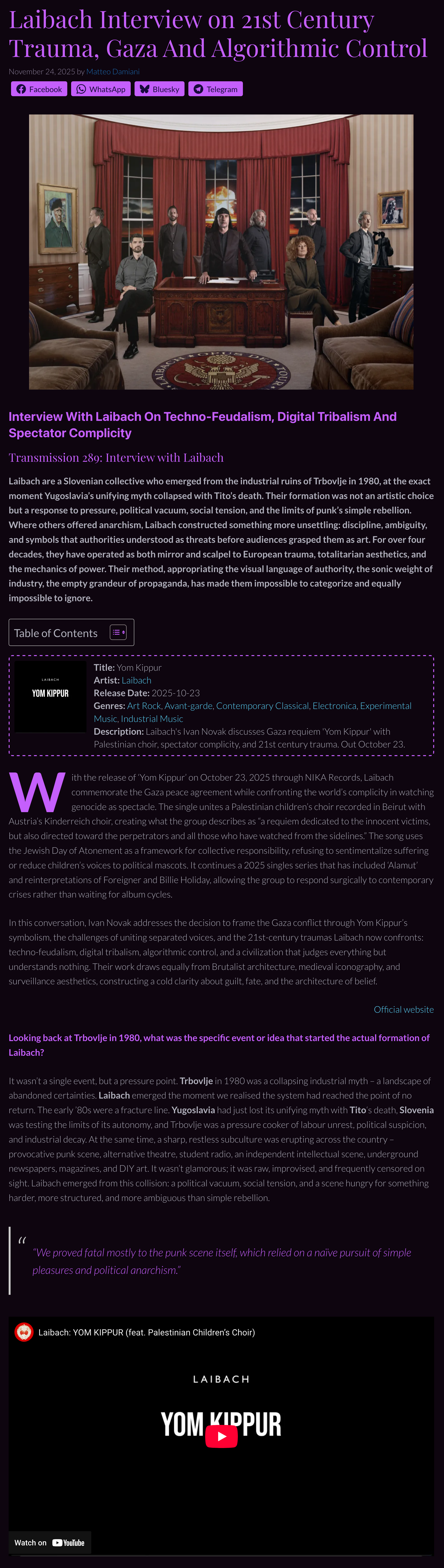 - Laibach Interview on 21st Century Trauma, Gaza And Algorithmic Control / 24. 11. 2025