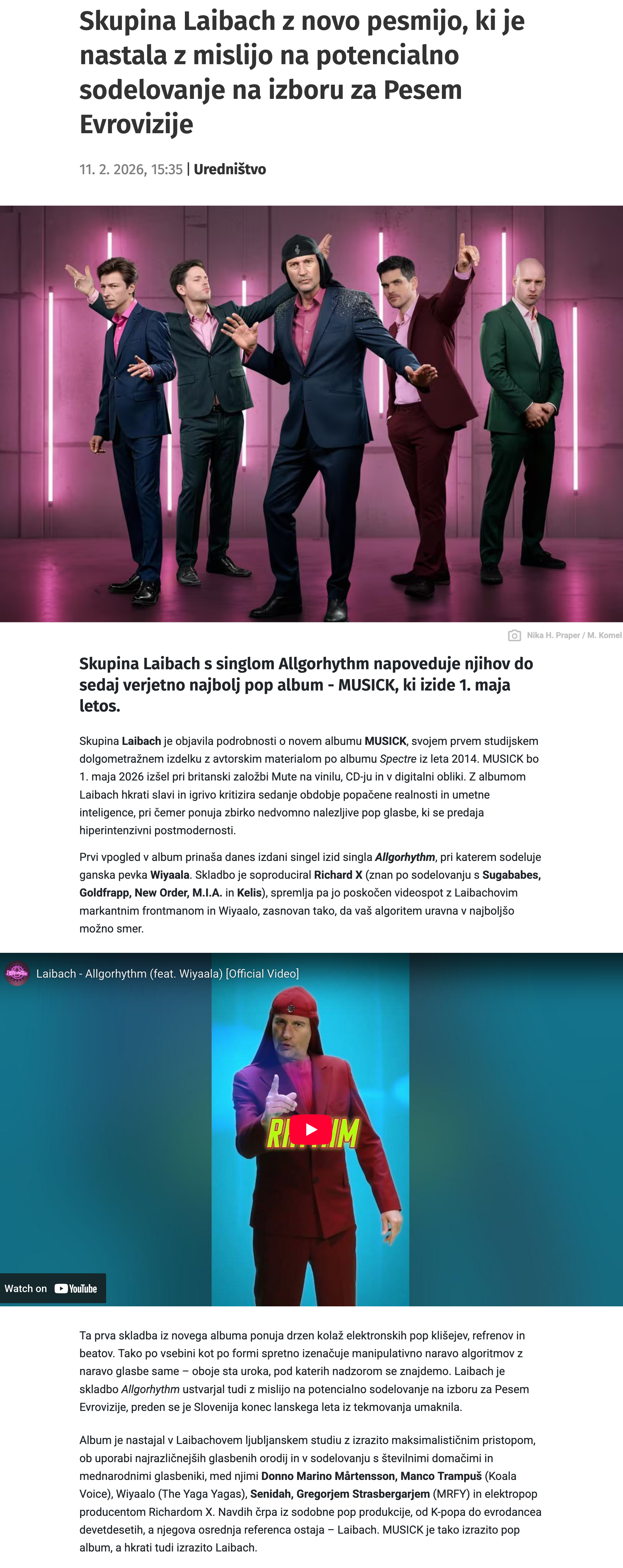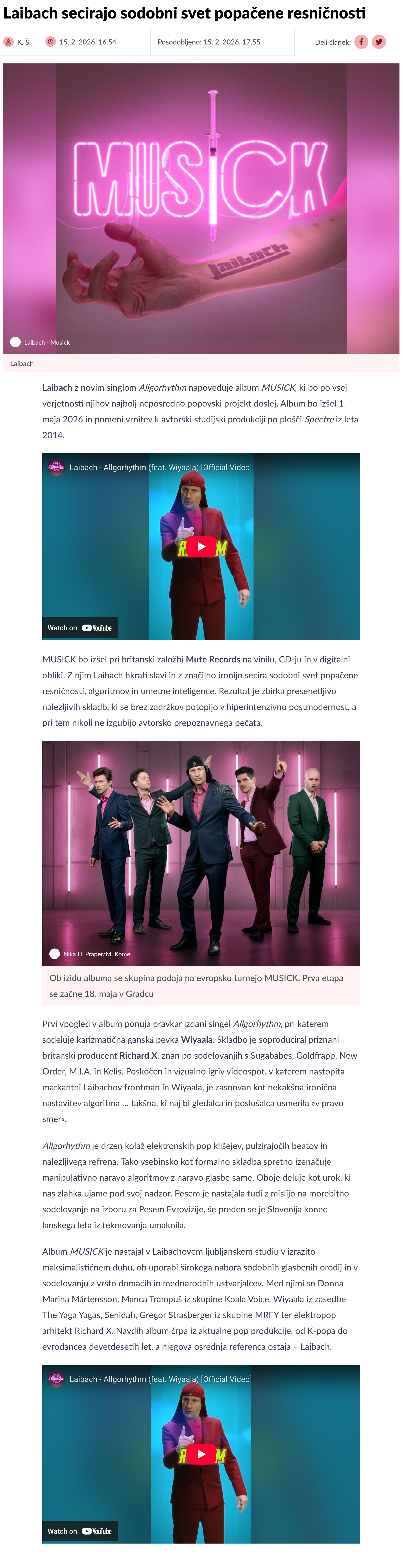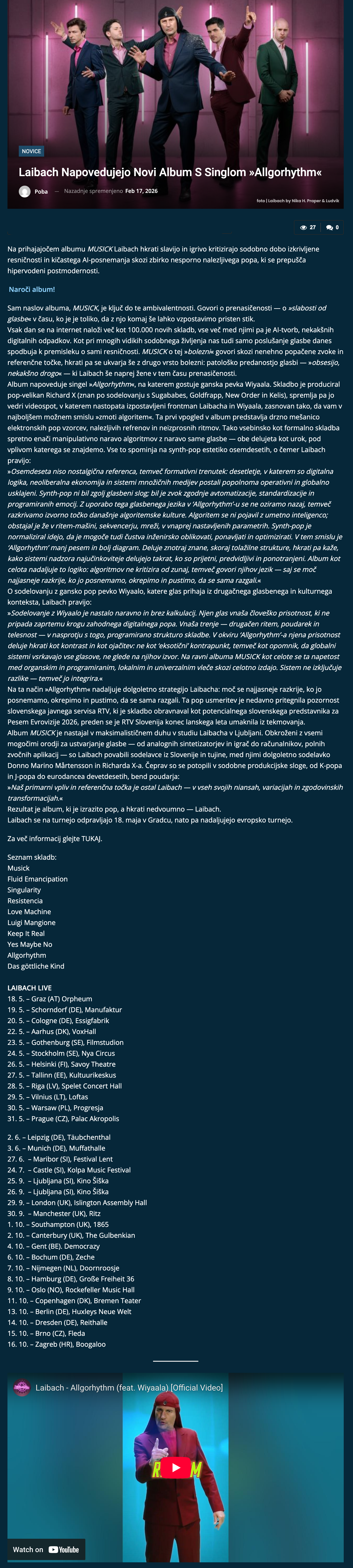 - Laibach napovedujejo novi album s singlom »Allgorhythm« / 17. 02. 2026